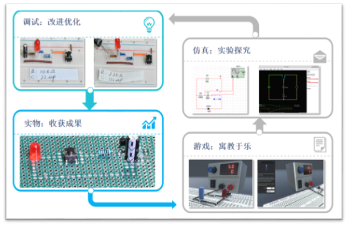 教材自主研发了AI智能体辅助教学系统,包括面向电子技术的智能问答系统、基于生成式AI的习题智能构建平台以及电路图AI检测系统,并构建跨学科融合知识图谱。此外,采用兴趣与项目双轮驱动的“游戏-仿真-调试-实物验证”四环循序教学模式,强化实践与应用环节。