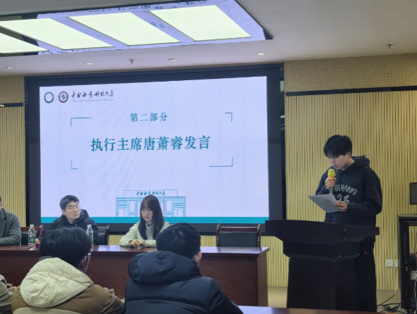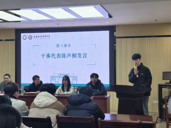 学生会主席唐萧睿结合自身任职经历,分享了团队协作与工作创新的实践经验,围绕元旦晚会等重点工作,明确了"为同学办实事、解难题"的工作导向,鼓励新成员大胆尝试、积极作为。干事代表陈声桐作表态发言,承诺将以此次培训为契机,强化服务意识、提升专业能力,团结协作完成各项工作任务。